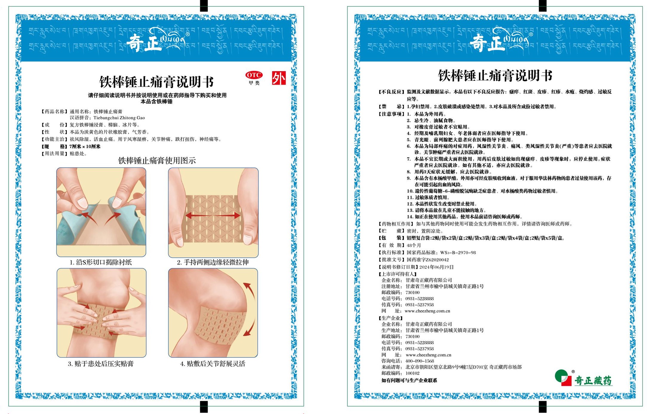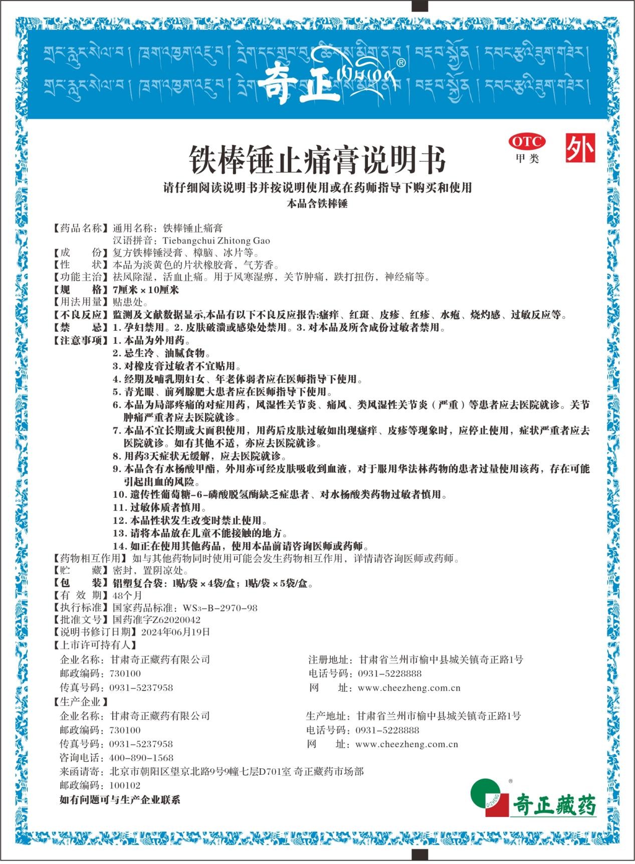 甘肅奇正藏藥有限公司按照鐵棒錘止痛膏獲批的《國(guó)家藥品監(jiān)督管理局藥品補(bǔ)充申請(qǐng)批準(zhǔn)通知書》(編號(hào):2024B00600)內(nèi)容,對(duì)鐵棒錘止痛膏藥品說明書中的【不良反應(yīng)】、【禁忌】和【注意事項(xiàng)】進(jìn)行了修訂及備案,現(xiàn)將新版說明書予以發(fā)布,如您需要更為詳細(xì)的信息或有特定的問題,可以聯(lián)系客服400-890-1568或撥打企業(yè)電話:0931-5228888。